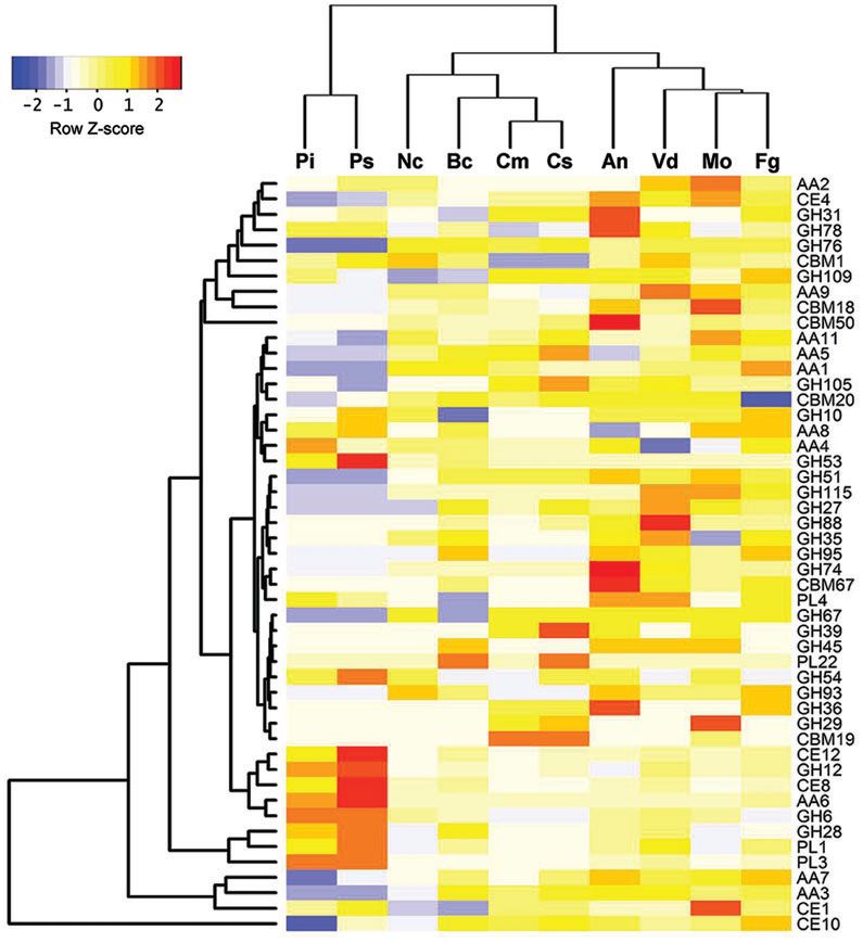 成熟的植物致病真菌可以分解并利用CAZymes的植物細胞壁多糖。尾孢菌(Cercospora sojina)含有596個預測的CAZymes。與其他真菌相比,C.sojina具有更大的潛在碳水化合物酯酶組,其可催化取代糖的N-去?;T?em>C. sojina基因組中,有大約23.5%的潛在分泌蛋白被預測為CAZyme,證明C.sojina可能在入侵期間使用大量CAZymes來消化宿主細胞壁。有趣的是,其中一個CAZymes家族,即糖苷水解酶GH109家族,是高度富集的(圖6)。