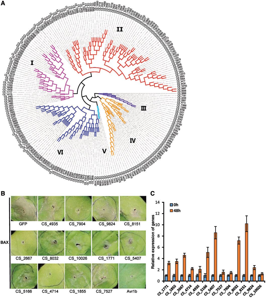 因此,我們嘗試研究效應器功能。促凋亡小鼠蛋白BAX誘導的本氏煙草程序性細胞死亡(PCD)在生理上可能與病原體引起的防御相關(guān)的過敏反應相似,提供了有價值的篩查可以抑制與防御相關(guān)的PCD的效應物的方法。我們隨機選擇50個效應子并在本塞姆氏煙草中瞬時表達它們以篩選可以抑制BAX觸發(fā)的PCD(BT-PCD)的潛在效應物。結(jié)果表明,約1/4選擇的效應子強烈抑制BT-PCD(圖7B)。此外,qRT-PCR結(jié)果顯示,大多數(shù)這些推定的效應子在C.sojina感染后48小時被轉(zhuǎn)錄誘導(圖7C),這意味著它們可能有助于大豆灰斑病的早期感染。