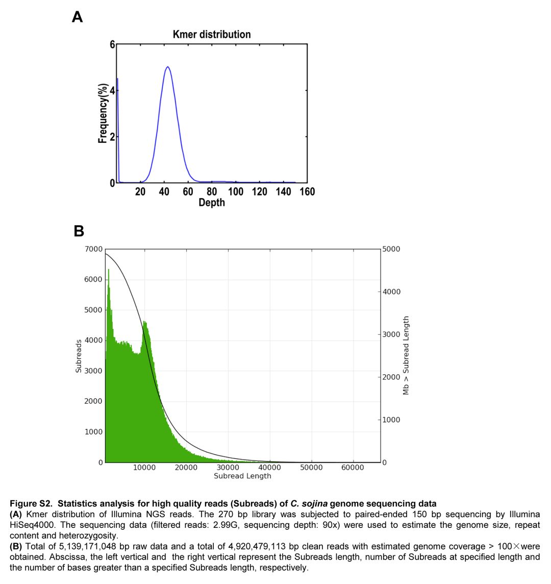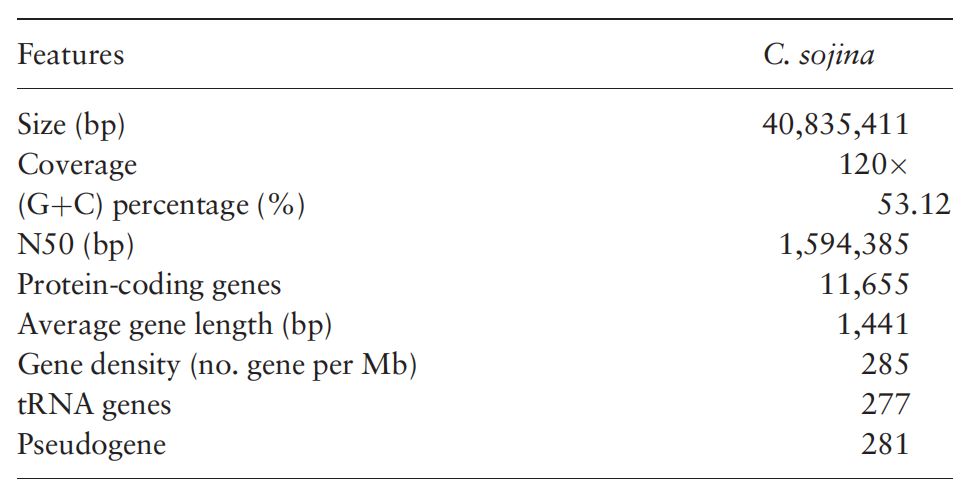 ? ? ? 由Cercosporasojina?Hara引起的大豆灰斑病是世界上大多數(shù)大豆種植國家的常見大豆病。大豆灰斑病的致病因子是一種大豆破壞性病原體。控制這種疾病的主要措施是培育抗性大豆品種或施用化學殺菌劑,由于病原體的進化和基因突變,施用化學殺真菌劑通常在田間迅速失去作用。大豆灰斑病導致大豆產(chǎn)量降低。因此,獲取Cercospora sojina?Hara基因組的信息對研究大豆的感染機制及提高大豆產(chǎn)量等尤為重要。