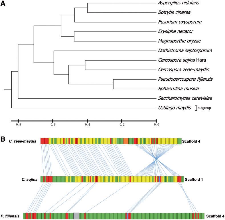 利用一組真菌的系統(tǒng)發(fā)育骨架基因分析了C. sojina和其他真菌物種的進化關(guān)系。系統(tǒng)發(fā)育分析表明C. sojina在進化上接近于尾孢菌(Cercospora zeae-maydis),一種可引起玉米葉斑病的植物病原體(圖3A)。此外,C. sojina也接近其他三個病原體Pseudocercospora fijiensisSphaerulina musivaDothistroma septosporum(圖3A)。