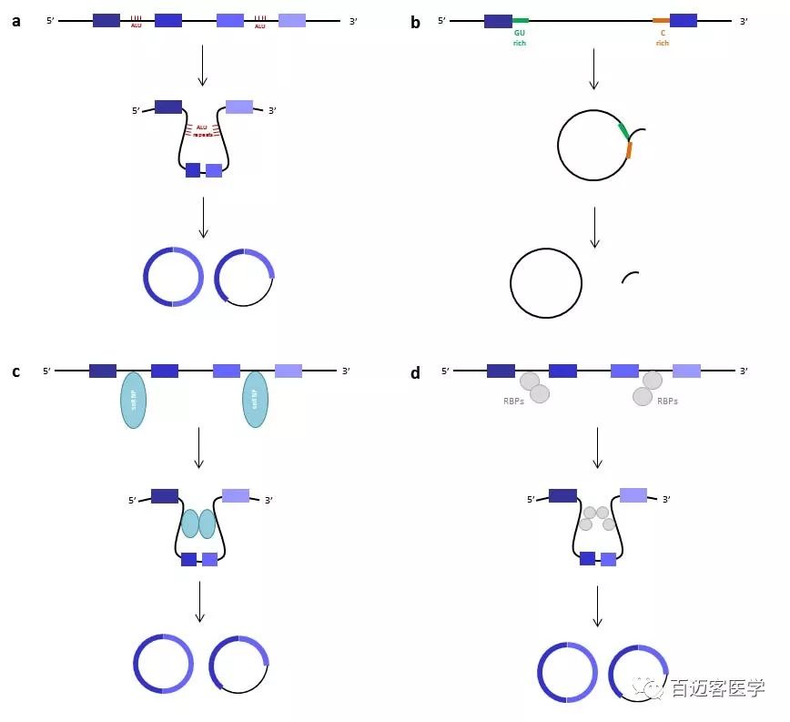 circRNA的形成途徑示意圖: