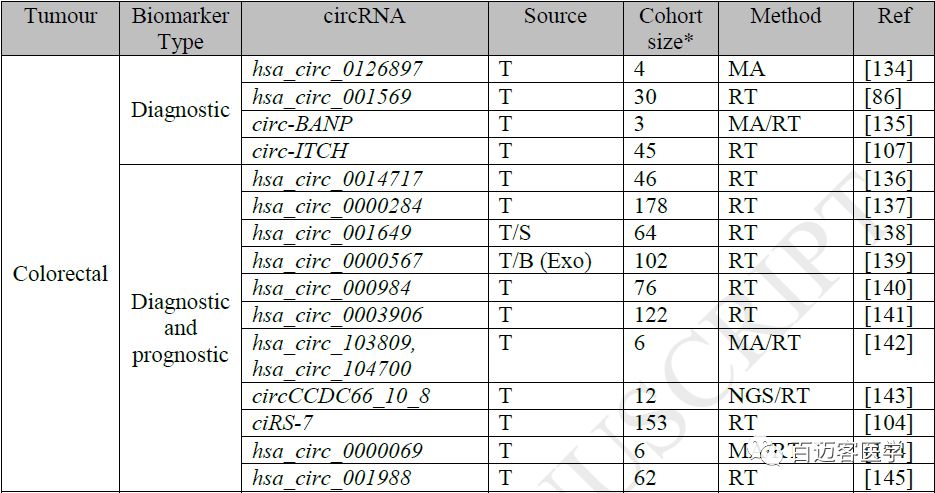 circRNA作為癌癥標(biāo)志物的研究(部分):
