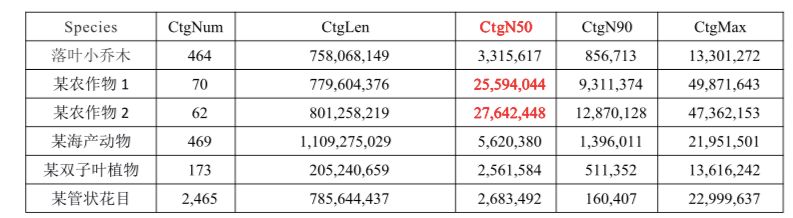 ContigN50是衡量基因組組裝好壞的一個(gè)重要指標(biāo),一定程度上來說,contigN50值越高表示組裝的質(zhì)量越好。組裝數(shù)據(jù)表中,ONT的組裝數(shù)據(jù)中contigN50水平均在1 Mb以上(測序深度的高低會(huì)有一定的影響,為了更好組裝指標(biāo),一般建議進(jìn)行100X以上),雜合度高的物種組裝結(jié)果同樣會(huì)略遜色于其它簡單物種。相較之前最強(qiáng)水產(chǎn)組裝結(jié)果(N50>22 Mb),ONT作物組裝N50最高值再創(chuàng)新高,達(dá)到了27 Mb?。?span style="color: #3366ff;">數(shù)據(jù)評估結(jié)果點(diǎn)擊查看)不管大家怎么看,反正小編被如此高的指標(biāo)深深的震撼了,希望技術(shù)團(tuán)隊(duì)再接再厲,創(chuàng)造新的記錄!