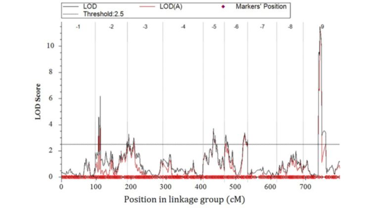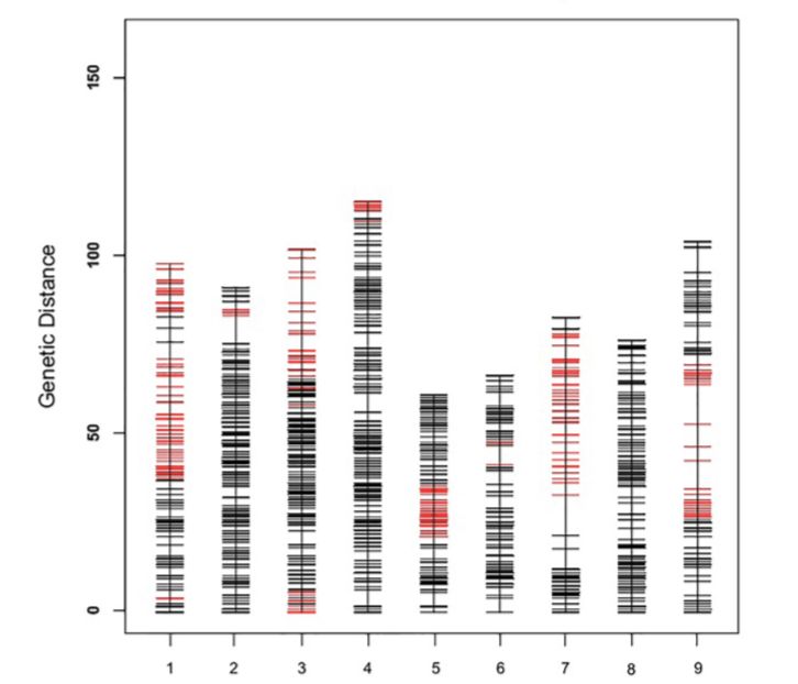 開(kāi)發(fā)了185,349個(gè)SLAF標(biāo)記,其中,20,250個(gè)SLAF標(biāo)記可以成功分型,最終上圖的標(biāo)記為4787個(gè),分布于9個(gè)LG中,構(gòu)建一張平均圖距為0.22cM的遺傳圖譜(如下圖),標(biāo)記間最大gap超過(guò)10cM,這可能是由于小孢子培養(yǎng)構(gòu)建DH群體的過(guò)程中,可能某種基因型更容易形成胚胎和再生植株,從而產(chǎn)生偏分離或某段染色體區(qū)域中無(wú)個(gè)體發(fā)生重組。