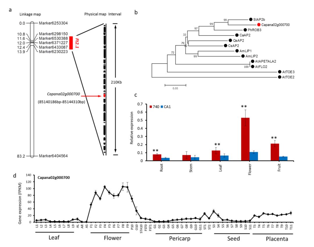 花期相關(guān)基因:針對(duì)主效QTL——Ft2.1進(jìn)行重點(diǎn)分析,它處于遺傳圖譜上的區(qū)間為0.763cM,對(duì)應(yīng)的Zunla-1基因組上物理區(qū)間為210Kb,包含25個(gè)基因,其中存在之前鑒定到的Capana02g000700基因,編碼花器官同源異型蛋白。進(jìn)化分析表明Capana02g000700的同源基因,金魚(yú)草LIP1和LIP2、擬南芥APETALA2和辣椒CaAP2,均在花器官發(fā)育階段存在重要作用。同時(shí),比對(duì)雙親間序列差異,發(fā)現(xiàn)8個(gè)SNP標(biāo)記和1個(gè)6bp的InDel標(biāo)記,這導(dǎo)致親本CA1存在2個(gè)氨基酸的缺失和5個(gè)氨基酸的改變。繼DNA層面分析之后,RNA層面的分析qRT-PCR和RNA-seq表明,這個(gè)基因在雙親間存在差異表達(dá),且在花器官中表達(dá)量最高,最終認(rèn)為Capana02g000700就是控制花期的候選基因。