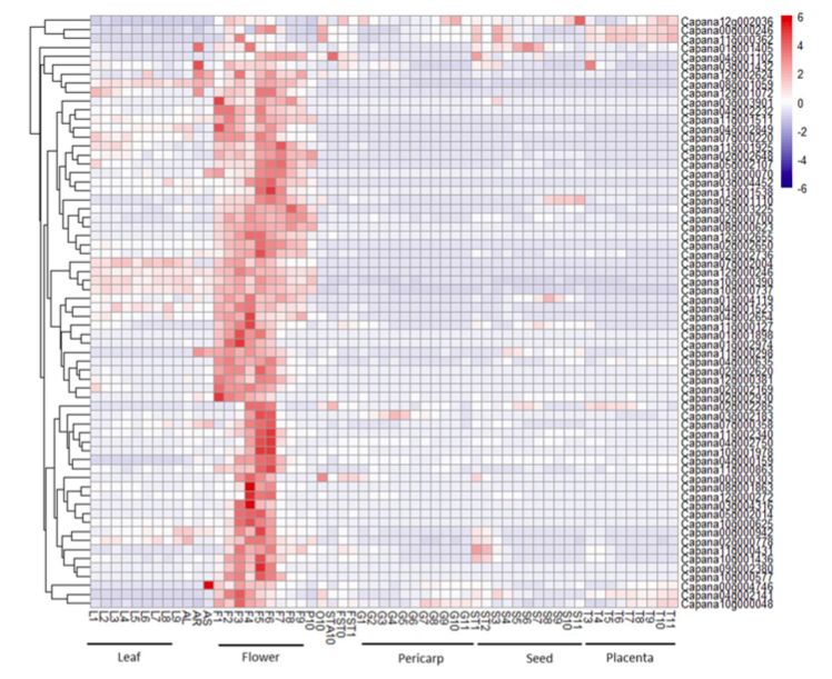 利用之前研究的不同發(fā)育階段和不同組織部的WGCNA分析結(jié)果,找到了花器官發(fā)育特定模塊,其中包含107個(gè)基因。這些基因中10個(gè)為T(mén)Fs,其中就包含已鑒定的Capana02g000700,這表明這些TFs可能與花發(fā)育的轉(zhuǎn)錄調(diào)控相關(guān)。這107個(gè)基因中,發(fā)現(xiàn)9個(gè)基因與Capana02g000700高度共表達(dá),分為3個(gè)家族,且其功能均與花發(fā)育相關(guān)。上述,均表明Capana02g000700通過(guò)抑制靶基因和/或TF表達(dá)來(lái)控制花器官發(fā)育,進(jìn)而影響花期。