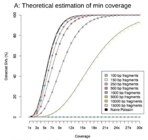 根據(jù)兩個人類數(shù)據(jù)集的錯誤情況和read長度,作者對兩條人的染色體模擬了50X?Pacbio?和ONT?read 。純粹的統(tǒng)計分析發(fā)現(xiàn),近10X覆蓋度的數(shù)據(jù)(平均長度10kb)就足夠去推斷所有SV斷點(一瞬間覺得自己可以省好多錢有木有),然而對于100bp的短read雙端測序至少要25X覆蓋度。當前這個統(tǒng)計只是一個理想情況,比如缺乏了重復和覆蓋度的偏移,因此是低估了所需的覆蓋度的。