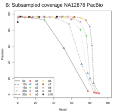 理想很豐滿、現(xiàn)實很骨感!理想情況下用10x覆蓋度測三代read就能檢測出來所有的結(jié)構(gòu)變異,但是現(xiàn)實肯定不夠啦~ 作者對真實的Pacbio 55X數(shù)據(jù),和Nanopore 28X數(shù)據(jù)所檢測到的SV和低深度下所檢測的SV進行比較。對于Pacbio數(shù)據(jù),15X的時候?qū)τ贜A12878和SKBR3樣品的SV能識別到69.64%和67.24%,如果提升到30X時,可分別識別到80.05%和76.63%。SKBR3的識別率相對較低主要因為它是癌癥樣品,有些極端的拷貝擴增。所以癌癥樣品要想識別到更多更準的SV,需要適當提升測序深度。