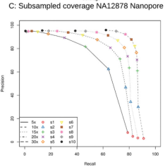 對于Nanopore的數(shù)據(jù),在20X的覆蓋度時就能達到82.24%的準確率和84.23%的識別率。不過這可能是因為ONT數(shù)據(jù)只測了28X。