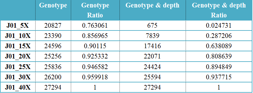 注:Genotype列代表不同深度下識別出的和40X SV基因型相同的SV個數(shù),Genotype ratio為SV占40X SV的比例。?Genotype & depth 為與40X SV基因型相同且read支持數(shù)大于10的SV個數(shù),Genotype & depth Ratio為基因型相同且read支持數(shù)大于10的SV比例。