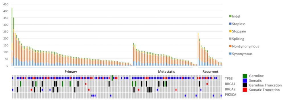 1、研究者通過全外顯子組測序(WES)分析了來自77名單側卵巢癌患者的122例新鮮凍存腫瘤組織(64個原發(fā)灶,41個轉移灶和17個復發(fā)灶,其中原發(fā)灶中含有分別與轉移灶和復發(fā)灶相匹配的樣本)以及匹配的正常DNA(來自靜脈血等)的突變情況。