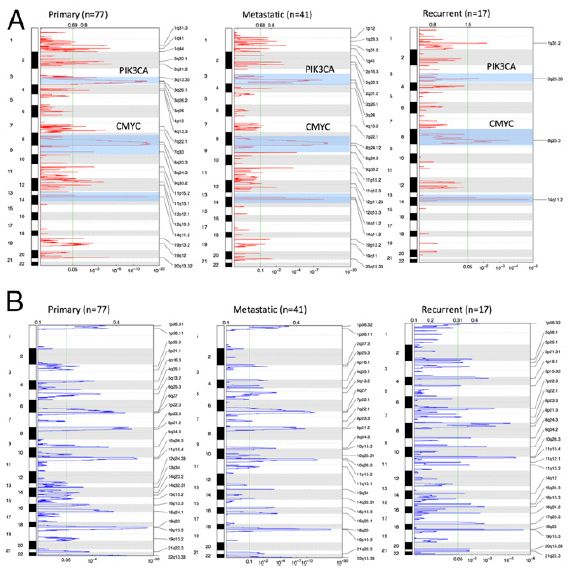 成對外顯子測序數據SCNA分析表明,在原發(fā)灶與復發(fā)灶匹配的17名患者中,4名患者獲得了PIK3CA擴增(3q26),2名患者在復發(fā)腫瘤中獲得了c-MYC擴增(8q23-24)。GISTIC分析表明,PIK3CA和c-MYC擴增在樣本間具有顯著重現性,其頻率在復發(fā)灶、轉移灶和原發(fā)灶依次降低。