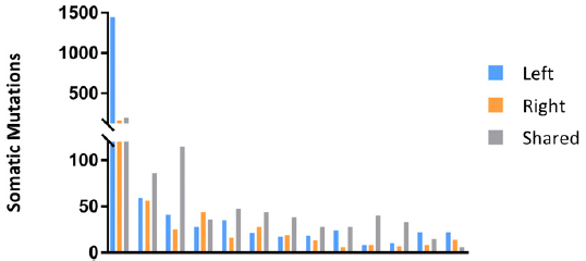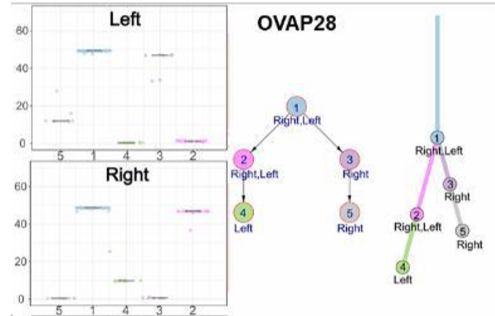2、研究者也對13對雙側卵巢癌(synchronous bilateral ovarian cancer,SBOC)進行了測序,評估腫瘤克隆進化,以確定左右兩側腫瘤是否獨立地作為2個不同的腫瘤,還是分別代表原發(fā)性和轉移性腫瘤。分析表明,體細胞突變在2側腫瘤廣泛共享,所有病例中均顯示2側腫瘤起源于共同的祖先。