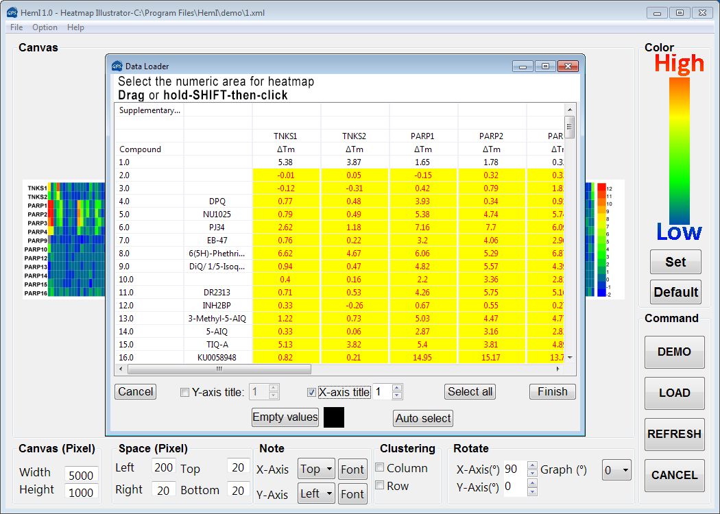 點(diǎn)擊L框中的LOAD按鈕即可打開要生成heatmap的文件,excel格式也可以。X-axis title是選擇橫軸坐標(biāo)對應(yīng)到輸入文件的哪一行,選擇auto select自動(dòng)選擇矩陣數(shù)據(jù)。
