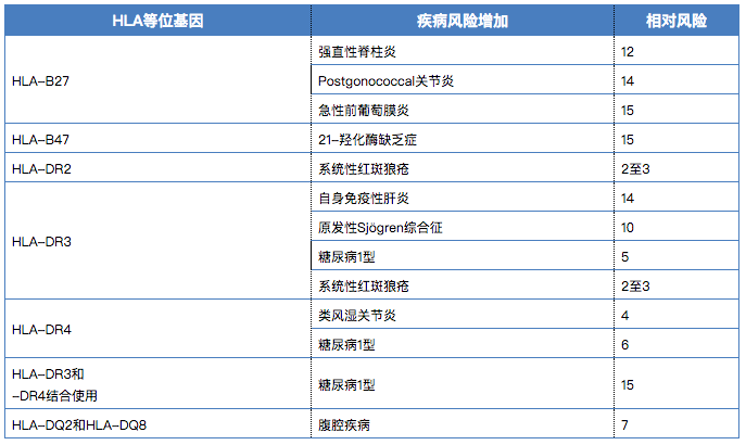 1972年Russel報告銀屑?。ㄅFぐ_)患者攜帶HLA-B13或HLA-B17。此后陸續(xù)發(fā)現(xiàn)大量其它疾病與特定的HLA相關(guān),其中,HLA-B27抗原見于大約90%的強直性脊椎炎病人,由此HLA-B27在臨床檢測中作為強直性脊柱炎的標志物,以至使HLA分型具有了診斷價值,甚至,能較早地證實疾病亞型之間的臨床區(qū)別,例如,尋常銀屑病與HLA相關(guān),而膿皰性銀屑病則不然;青少年性胰島素依賴型糖尿病與HLA-B8、HLA-Bw15和HLA-B18相關(guān),而晚期發(fā)作型糖尿病并無這種相關(guān)性。因此,特定類型的HLA便成為某些疾病的遺傳標志。在疾病研究的延伸面,是關(guān)于HLA與長壽的關(guān)系,目前亦形成一個新的研究熱點。目前研究比較清楚的幾個HLA與自身免疫疾病相關(guān)關(guān)系如下表: