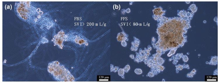 當(dāng)曝氣不變時(shí),F(xiàn)BS的氧轉(zhuǎn)運(yùn)效率(OTE)急劇降低(80 mL/g-MLSS),污泥體積指數(shù)(SVI)較高(>120?mL/g-MLSS);FFS的OTE值保持正常,SVI值低于80?mL/g-MLSS,表明FBS污泥處理性能較差,OTE的降低可能與菌絲的膨脹有關(guān)(圖1)。