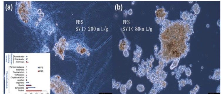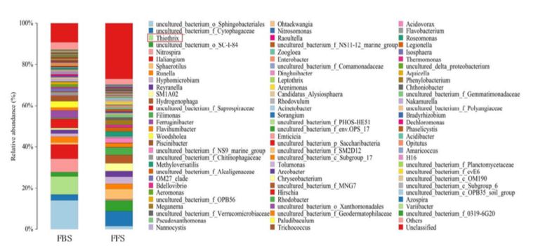 FBS和FFS的菌群結(jié)構(gòu)如圖7所示。FBS和FFS含有大量的共有菌,其中絲硫菌屬(thiothrix)、球衣菌屬(Sphaerotilus)、古字狀菌屬(Runella)、meganema(甲基桿菌科分類下的屬)、纖毛菌屬(Leptothrix)、金黃桿菌屬(chryseobacterium)、毛球菌屬(Trichococcus)、黃桿菌屬(Trichococcus)、isosphaera(浮霉菌科分類下的屬)和浮霉菌科(planctomycetaceae)是FBS和FFS豐度排名前十的菌;?FBS和FFS的優(yōu)勢(shì)菌存在差異,未分離培養(yǎng)(uncultured)的噬纖維菌(cytophagaceae)和鞘脂桿菌(sphingobacteriales)分別在FBS和FFS中豐度最高;FFS和FBS的所有菌在各自反應(yīng)器的排出水中均被檢測(cè)到。從圖8來看,絲硫菌屬(thiothrix)在FFB中的相對(duì)豐度超過8.5%,而在FFS中數(shù)量極少,絲硫菌屬(thiothrix)的長(zhǎng)菌絲(0.5-1.5 μm)會(huì)連接污泥絮狀物,導(dǎo)致污泥降解能力降低,污水的表面粘度增加;盡管球衣菌屬(Sphaerotilus)和古字狀菌屬(Runella)在FFS和FBS中的豐度均較高,但它們的菌絲較短,對(duì)污泥沉降、表觀粘度和氧轉(zhuǎn)運(yùn)的負(fù)面影響較小;其他絲狀細(xì)菌的豐度較低,影響程度較小。因此推測(cè),絲硫菌屬(thiothrix)就是影響FBS氧轉(zhuǎn)運(yùn)的最大“元兇”。從種水平來看,絲硫菌屬(thiothrix)分類下的eikelboomii是FBS的優(yōu)勢(shì)菌,至此,“真兇”也基本確定。