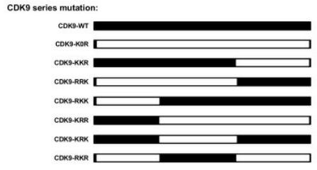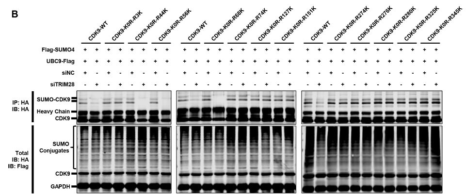 接下來作者試圖鑒定應(yīng)該在CDK9?賴氨酸殘基上發(fā)生的SUMO化位點(diǎn)。賴氨酸突變實(shí)驗(yàn)結(jié)果:CDK9-K0R突變體含有所有賴氨酸變?yōu)榫彼岬耐蛔儯耆兄沽薈DK9被SUMO化的能力;其他CDK9突變體仍然能夠通過TRIM28進(jìn)行SUMO化,這表明在整個(gè)CDK9序列中可能存在多個(gè)SUMOylation位點(diǎn)。采用基于CDK9-K0R全突變體的逆轉(zhuǎn)突變策略,發(fā)現(xiàn)CDK9上的幾個(gè)賴氨酸顯著SUMO化。其中,多個(gè)SUMO化位點(diǎn)與CDK9 C-末端自身磷酸化位點(diǎn)相鄰,據(jù)報(bào)道這些位點(diǎn)是Tat-P-TEFb與TAR RNA高親和力結(jié)合所必需的,即?SUMO化可以通過阻止相鄰的磷酸化來降低結(jié)合能力。