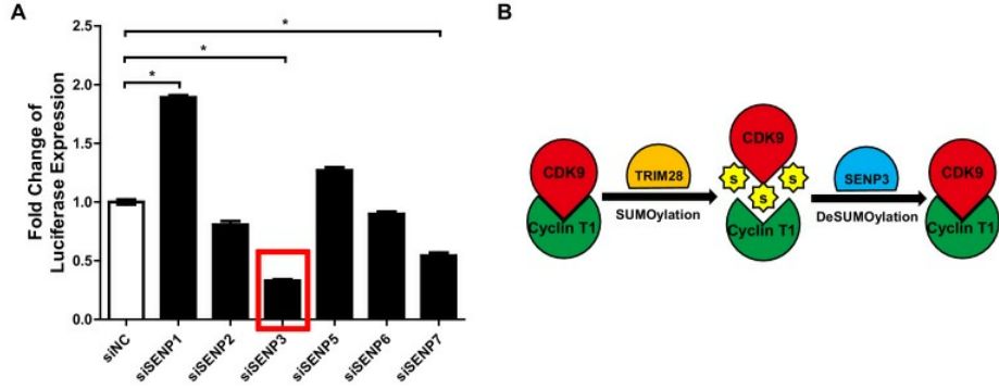 作者進(jìn)一步研究SUMO4在TRIM28介導(dǎo)的CDK9 SUMO 經(jīng)中的作用來鑒定其潛在的機(jī)制。通過CDK9與SUMO1、SUMO2和SUMO4共同過表達(dá)實(shí)驗(yàn),發(fā)現(xiàn)CDK9主要由SUMO1和SUMO4 SUMO化。補(bǔ)充過表達(dá)TRIM28后,SUMO-CDK9量變得更豐富。然而,如果僅用TRIM28共表達(dá)CDK9但沒有SUMO E2 酶UBC9時(shí),SUMO化水平?jīng)]有增加,這表明TRIM28介導(dǎo)的SUMO化是UBC9依賴性的。當(dāng)TRIM28表達(dá)逐漸增加時(shí),SUMO-CDK9 化水平以劑量依賴性增加。體外SUMO化測定表明,僅當(dāng)將SUMO4、E1 SAE1/UBA2,E2 UBC9和TRIM28一起提供到SUMO化反應(yīng)緩沖液中時(shí),SUMO4與CDK9結(jié)合。在HeLa細(xì)胞中敲除TRIM28后,SUMO化的CDK9減少。前面的siRNA文庫篩選實(shí)驗(yàn)中表明,幾種SUMO特異性蛋白酶(SENP)抑制HIV-1表達(dá),尤其是SENP3,用TRIM28共表達(dá)SENP3,發(fā)現(xiàn)SENP3阻止了TRIM28介導(dǎo)的CDK9 SUMO化。作者在原代CD4+?T細(xì)胞中證實(shí)了以上結(jié)論??傊?,TRIM28介導(dǎo)SUMO4與CDK9的結(jié)合,其被SENP3逆轉(zhuǎn)。