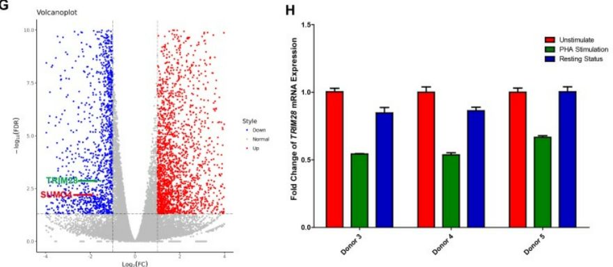通過實(shí)驗(yàn)發(fā)現(xiàn)si-TRIM28過表達(dá)抑制了HIV-1啟動(dòng)子活性的基礎(chǔ)水平,并以劑量依賴的方式挽救了HIV-1抑制;當(dāng)與HIV-1 Tat和TNFα組合過表達(dá)時(shí),上調(diào)更顯著;TRIM28在多種細(xì)胞系和原代細(xì)胞中普遍表達(dá)。為搜索HIV-1潛伏相關(guān)基因,作者利用RNA-Seq比較未刺激和PHA刺激的原代CD4+?T細(xì)胞中的基因表達(dá)作為補(bǔ)充實(shí)驗(yàn),TRIM28在未刺激的原代CD4+?T細(xì)胞中高表達(dá),并在PHA激活后下調(diào)。當(dāng)活化的CD4+?T細(xì)胞恢復(fù)到靜止?fàn)顟B(tài)時(shí),TRIM28的表達(dá)再次上調(diào)。為了測試TRIM28是否有助于HIV-1潛伏,在HIV-1潛伏細(xì)胞系J-Lat 10.6以及其他HIV潛伏細(xì)胞系模型(J-Lat 6.3/8.4/9.2和15.4)中敲低了TRIM28,發(fā)現(xiàn)TRIM28的缺失上調(diào)了HIV-1的表達(dá)。此外,當(dāng)補(bǔ)充廣泛定義的LRA:組蛋白去乙?;福℉DAC)抑制劑SAHA或BET結(jié)構(gòu)域抑制劑JQ-1時(shí),HIV-1重新激活增強(qiáng)得更高。