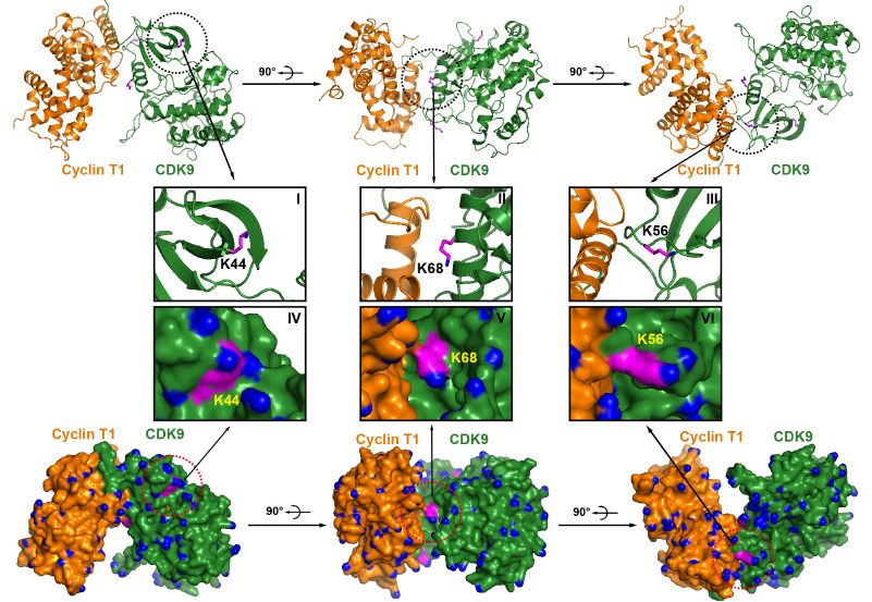 為了進(jìn)一步確定哪些位點(diǎn)確實(shí)僅被TRIM28 SUMO化,作者敲除了內(nèi)源性TRIM28并測試了上述鑒定候選位點(diǎn)的SUMO化潛力,發(fā)現(xiàn)Lys44、Lys56和Lys68的SUMO 化信號(hào)在缺乏內(nèi)源性TRIM28時(shí)完全消失,進(jìn)一步支持這些位點(diǎn)被TRIM28特異性SUMO化。直接分析富集的SUMO-CDK9的靶特異性SUMO-MS也證實(shí)了該結(jié)果。Lys44的乙?;瞧浼っ富钚运匦璧?,其他2個(gè)SUMO化位點(diǎn)Lys56和Lys68在CDK9和細(xì)胞周期蛋白T1的相互作用區(qū)域內(nèi)。SUMO蛋白是多肽大分子,它的存在可以形成空間位阻,從而阻止P-TEFb復(fù)合物的形成。