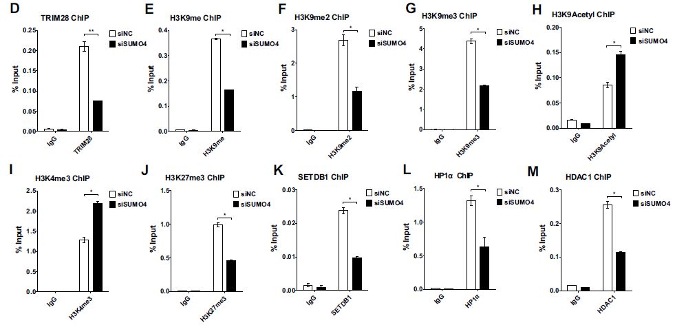 接下來探究了SUMO4是否可以影響TRIM28的功能和HIV-1啟動(dòng)子的表觀遺傳狀態(tài):SUMO4敲低后,超過一半的TRIM28從HIV-1 LTR中丟失,表明TRIM28在HIV-1 LTR上的富集可能是部分SUMOylation依賴性的;SUMO4敲低后H3K9me、H3K9me2和H3K9me3在HIV-1 LTR上顯著降低,以及H3K9甲基化’writer’ SETDB1和’reader’ HP1α顯著降低;H3K9乙?;虷3K4me3的顯著上調(diào)和HDAC1的下調(diào),這與先前報(bào)道TRIM28以SUMO化依賴性方式募集SETDB1、HP1α和HDAC1一致;H3K27me3在HIV-1 LTR上也降低。一些多梳抑制復(fù)合物2(PRC2)組分如EZH2和SUZ12(H3K27me3的主要’writer’)可能被SUMO4 SUMO化,導(dǎo)致修飾功能的增強(qiáng)。