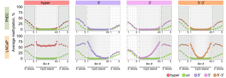 采用chip-seq數(shù)據(jù),分析H3K4me1在癌癥CpG島超甲基化中的富集方式。H3K4me1高富集于hESCs CpG島的body區(qū),在癌癥中呈現(xiàn)廣泛超甲基化。相反,癌癥中未甲基化的CpG島,在hESCs中表現(xiàn)為邊界雙峰富集及島區(qū)域降低。并且,文章發(fā)現(xiàn)一種hESCs中不對(duì)稱的H3K4me1富集模式,在對(duì)應(yīng)5’或3’內(nèi)CpG島邊界,易于癌癥中DNA甲基化。通過(guò)可視化圖展現(xiàn)了候選的CpG島,顯示癌癥中5’和3’的甲基化堆積,可以由正常前列腺細(xì)胞中H3K4me1預(yù)先標(biāo)記。