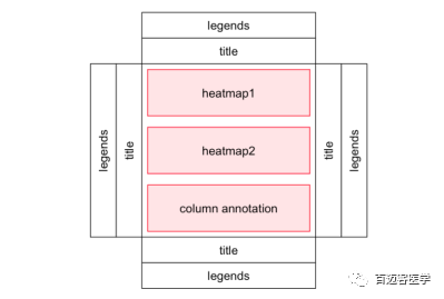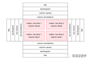 單個熱圖由熱圖主體和熱圖組件組成。 熱圖主體可以按行和列分割。 熱圖組件是標(biāo)題,樹形圖,矩陣名稱和熱圖注釋,它們放在heamap體的四個側(cè)面上。