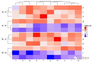 Heatmap(mat,?split?=?data.frame(rep(c(“A”,?“B”),?6),?rep(c(“C”,?“D”),?each?=?6)))