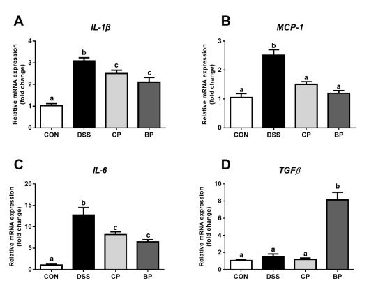 圖3. CP和BP對(duì)大鼠結(jié)腸炎癥相關(guān)基因表達(dá)的影響。A:白細(xì)胞介素(IL-1β);B:?jiǎn)魏思?xì)胞趨化蛋白(MCP-1);C:白細(xì)胞介素(IL-6);D:轉(zhuǎn)化生長(zhǎng)因子(TGF-β)。