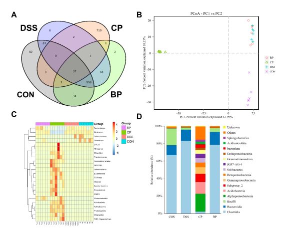 圖5. CP和BP對(duì)大鼠結(jié)腸炎癥腸道微生物的影響。A:韋恩圖;B:PCoA分析(基于weighted UniFrac的組間樣品差異分析);C:豐度聚類(lèi)熱圖;D:豐度柱狀圖(“門(mén)”水平的前15個(gè)物種)。