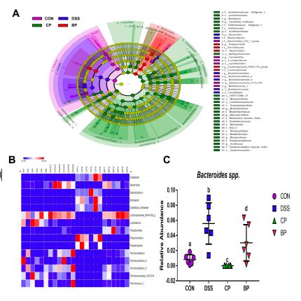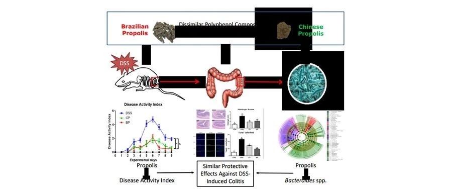 盡管中國(guó)蜂膠(CP)和巴西蜂膠(BP)的多酚組成不同,產(chǎn)生的生理效應(yīng)也不同,然而它們均顯著降低了擬桿菌(Bacteroides spp)的種群豐度,從而對(duì)DSS誘導(dǎo)的結(jié)腸炎起到了的相似的保護(hù)作用。