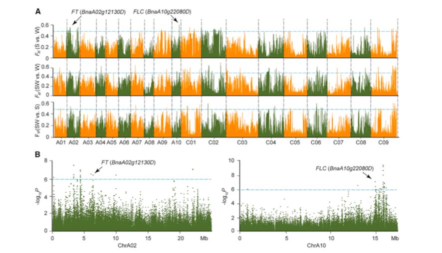 該研究對991份油菜天然種質資源進行了遺傳多樣性的測序和鑒定。通過對兩個不同的參考基因組,即“Darmor-bzh”和“Tapidor”基因組的定位讀數產生的兩組SNPs的群體遺傳學分析,得出了一致的結論。遺傳多樣性和連鎖不平衡參數表明甘藍型油菜兩個亞基因組的進化是不對稱的。選擇性掃描分析揭示了與調控植物發(fā)育和應激反應的各個方面相關的基因的遺傳變化。并對影響開花時間的SNPs進行了探索。