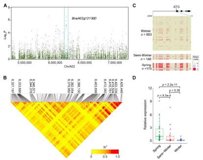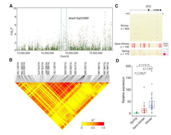 BnaA10g22080D是擬南芥FLC的一個假定的同源基因,在Chr.A10的14.99-15.01 Mb之間的區(qū)域內被鑒定(圖3B)。GWAS和LD分析表明,BnaA10g22080D的5’調控區(qū)的SNPs與品種間開花時間的變化顯著相關(圖6A和6B)。