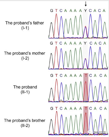 對(duì)兩兄弟及其父母進(jìn)行了全外顯子組測(cè)序WES,平均覆蓋深度為120×,目標(biāo)區(qū)域覆蓋度為99.87%。排除在任何變異數(shù)據(jù)庫(kù)中MAF>0.05的變異,錯(cuò)義突變、無(wú)義突變、移碼突變和剪接位點(diǎn)突變等優(yōu)先保留。此外,SIFT、PolyPhen-2和Mutation Taster等同時(shí)預(yù)測(cè)為具有潛在有害性的變異也被保留用于進(jìn)一步評(píng)估。