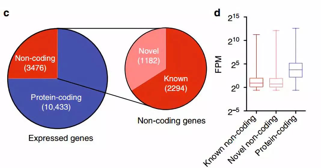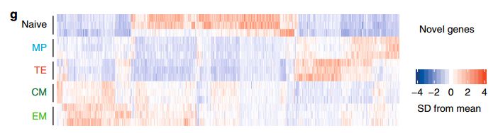 從LCMV感染小鼠中分離病毒特異性的CD8+T細(xì)胞亞群,對(duì)不同類型的細(xì)胞進(jìn)行RNA-seq。包括初始T細(xì)胞、終末分化效應(yīng)T細(xì)胞(short-livedterminal effector ,TE)、記憶前體T細(xì)胞(memory precursor ,MP)、中心記憶T細(xì)胞(central memory ,CM) 、效應(yīng)記憶T細(xì)胞(effector memory ,EM)?;跀?shù)據(jù)組裝分析,共鑒定到13909個(gè)unique genes,75%是蛋白編碼基因,25%是非編碼。在非編碼基因中,三分之一在數(shù)據(jù)庫(kù)中未收錄,因?yàn)檎J(rèn)為是新基因。這些新基因比已注釋非編碼基因有較高的表達(dá)水平,但這兩類基因均比編碼基因低表達(dá)。采用CPAT進(jìn)行編碼潛能分析,大部分新轉(zhuǎn)錄本包括單個(gè)外顯子,不到25%的新轉(zhuǎn)錄本包括2個(gè)及以上外顯子。雖然不具有蛋白編碼潛能,但大部分新基因在CD8+T細(xì)胞分化過(guò)程中表現(xiàn)出特異性,包括記憶細(xì)胞中的特異性表達(dá)。