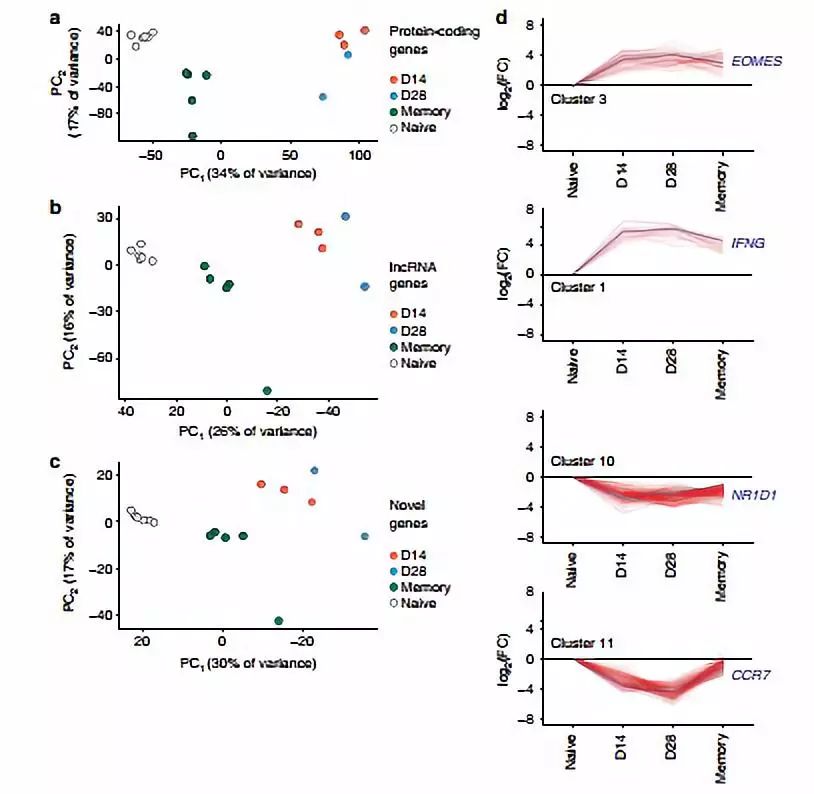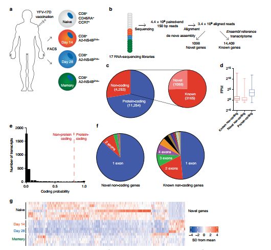 基于之前健康志愿者的測(cè)序數(shù)據(jù)(采用YFV-17D黃熱疫苗,分選CD8+T細(xì)胞,收集初始T細(xì)胞,14天CD8+T細(xì)胞、28天CD8+T細(xì)胞、記憶細(xì)胞),進(jìn)行轉(zhuǎn)錄組分析。鑒定出已注釋的3165個(gè)非編碼轉(zhuǎn)錄本,1098個(gè)未注釋的。與小鼠數(shù)據(jù)相比,人數(shù)據(jù)中也表現(xiàn)出編碼基因表達(dá)高于非編碼基因。同樣許多鑒定的新轉(zhuǎn)錄本是單外顯子,編碼潛能低于鼠鑒定的轉(zhuǎn)錄本。與小鼠數(shù)據(jù)類似,許多新轉(zhuǎn)錄本在T細(xì)胞分化中表現(xiàn)出特異性。