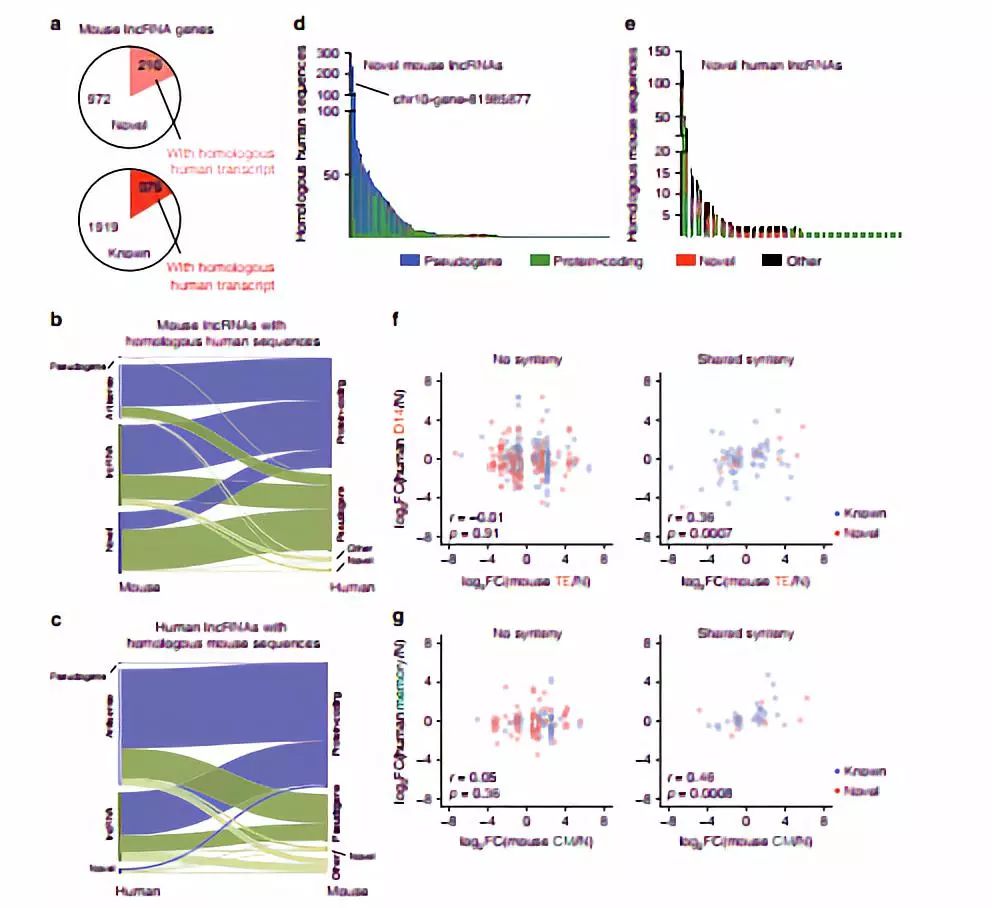 由于lncRNA在小鼠與人數(shù)據(jù)表現(xiàn)出的生物學(xué)過(guò)程相似性,將兩者轉(zhuǎn)錄本序列進(jìn)行比對(duì)。僅有一部分小鼠lncRNA包含人轉(zhuǎn)錄本同源序列,當(dāng)然也會(huì)存在比對(duì)到人編碼基因及假基因上的序列。許多同源lncRNA在對(duì)比物種上有多個(gè)同源基因座。除了序列保守,共線性(位置保守)也是考慮因素。因此接下來(lái)分析T細(xì)胞分化過(guò)程中保守性的lncRNA。通過(guò)比較二者效應(yīng)和記憶期基因的差異倍數(shù),但在任一個(gè)階段未發(fā)現(xiàn)保守且表達(dá)顯著相關(guān)的基因。但這些保守性基因在這2個(gè)時(shí)期表現(xiàn)出中度相關(guān)(r = 0.36 and 0.46, p = 0.0007 and 0.0008, respectively)。