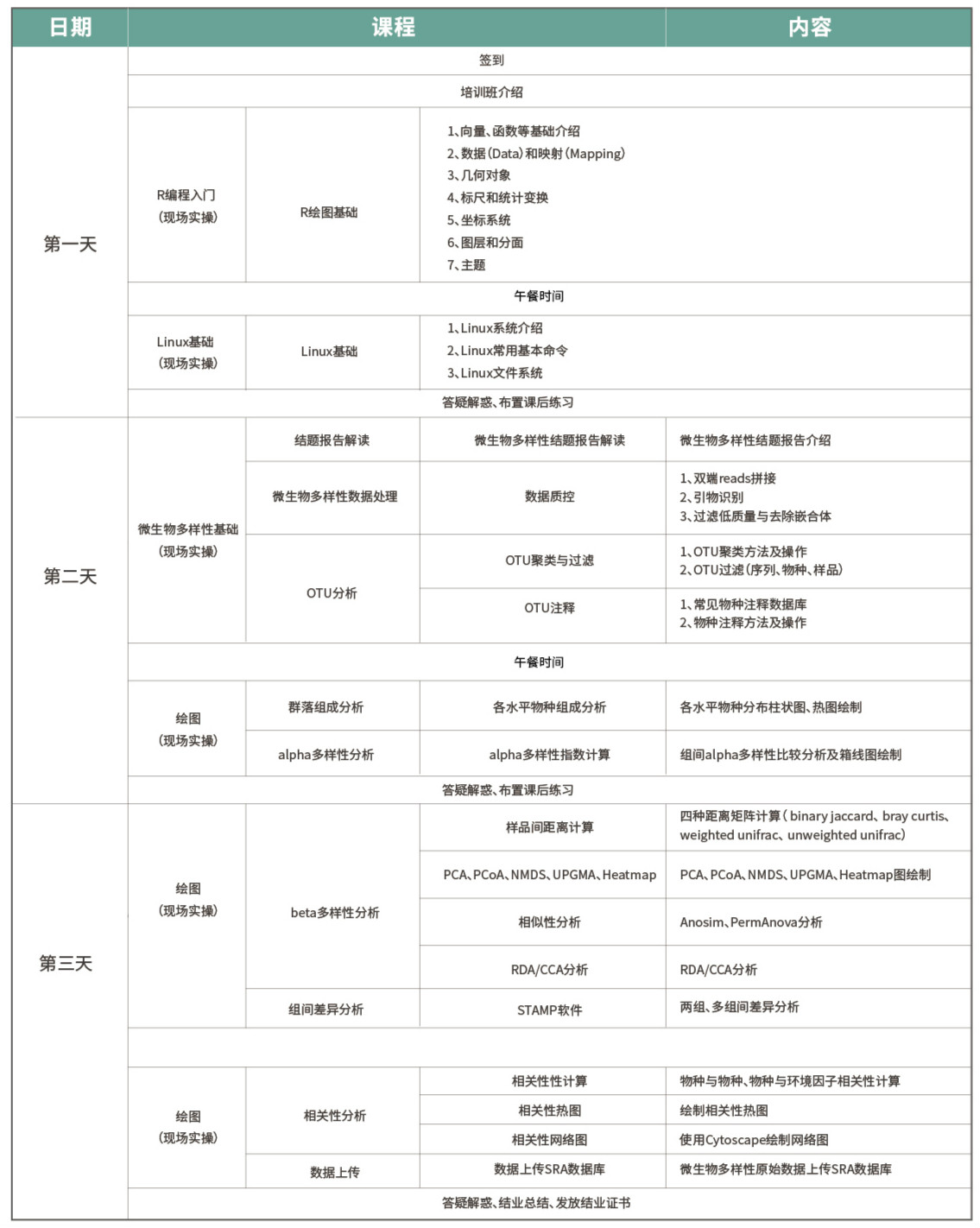課程第一天為linux系統(tǒng)和R語言基礎的講解,帶大家熟悉分析中我們常用的命令與代碼,為后兩天的培訓打好基礎!第二、第三天的授課講師是我們的微生物部經手上千項目的研發(fā)經理,其從實際結果出發(fā),為大家講解具體的技術原理和計算方法,原理了解了,那就到具體實操了,從實操中發(fā)現(xiàn)問題從而解決問題那才真的干貨??紤]人多顧不上?您放心,我們現(xiàn)場還有助教,可以隨時溝通,保證學習通暢!