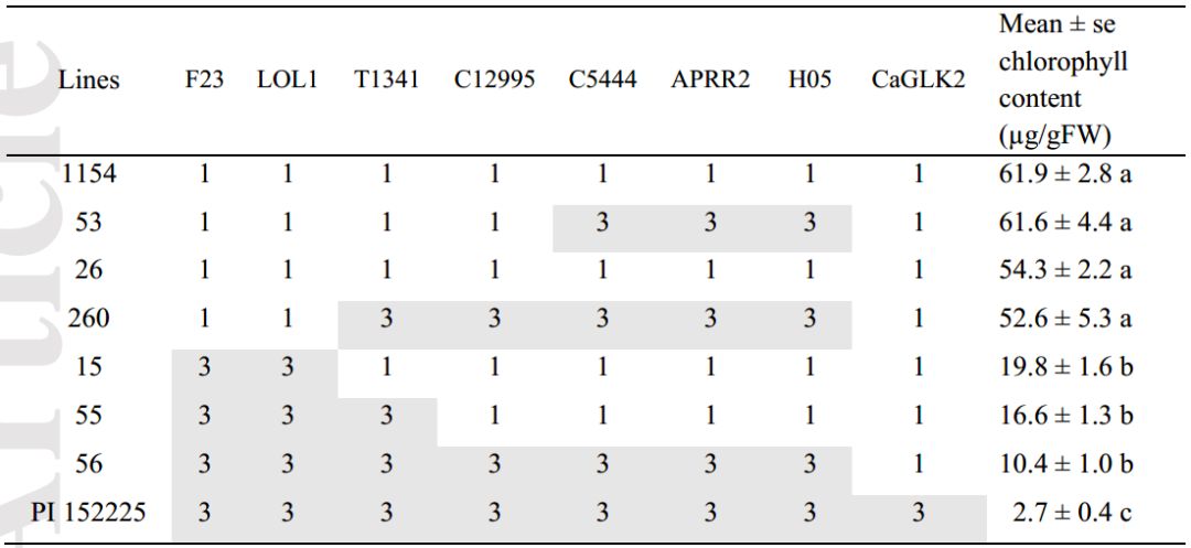 為進(jìn)一步精細(xì)定位pc1,本研究對624個F2(1154 × NIL 86-45)單株標(biāo)記分型以篩選QTL區(qū)域內(nèi)的交換單株。基于前期研究,標(biāo)記T1341與QTL peak連鎖最為緊密 (Brand et al., 2012),作者又在T1341附近開發(fā)出6個標(biāo)記,在標(biāo)記F23與H05間,共篩選出34個F4交換單株,可代表6種基因型組合,橫跨Chr.1:5cM的區(qū)間。為排除pc1pc10互作的影響,作者將所有交換單株的CaGLK2固定為1154等位基因。結(jié)果分析暗示,F(xiàn)23與LOL1是與QTL連鎖最為緊密的標(biāo)記,因為line 15含PI 152225最短的導(dǎo)入片段且葉綠素含量顯著低于1154,而line 260在這2個標(biāo)記間含1154等位且與1154葉綠素含量沒有顯著性差異。此外,lines 53與260在APRR2-like位點(diǎn)含有PI 152225等位,葉綠素含量卻與1154沒有顯著差異,暗示此基因(APRR2)在本研究中的遺傳背景下不影響葉綠素含量(表1.)。