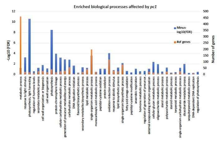 為研究pc1參與影響的細(xì)胞學(xué)過程,本研究對混池間983個差異表達(dá)基因進(jìn)行GO富集分析并根據(jù)生物過程進(jìn)行分類(圖5)。最顯著的GO term過程與光合作用及氧化還原有關(guān),這兩個過程包含184個DEGs,被分成17個亞類,其中最大的一類是氧化還原過程。這一類基因與葉綠素合成下調(diào)有關(guān),例如,POR,CAOHEMA1,還與葉綠素降解基因上調(diào)有關(guān),例如,CA00g73130,暗示葉綠素合成與降解受這個QTL調(diào)控。另一類重要基因,包含Chlorophyll a/b-結(jié)合蛋白的多個成員基因(CA01g17090,CA02g12050,CA02g12060,CA02g12070等),在淡綠混池中下調(diào)表達(dá),它們參與光合、蛋白發(fā)色團(tuán)及光刺激響應(yīng)等過程。另外,若干與碳固定有關(guān)的Rbc家族基因在淡綠混池中也呈現(xiàn)下調(diào)表達(dá)。
