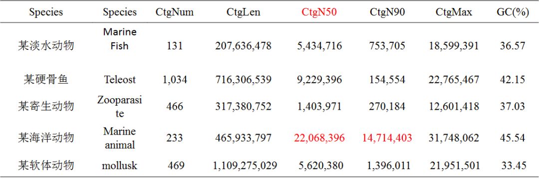 注:Species:分析的物種信息;CtgNum:contig數(shù)目;CtgLen:contig總長(zhǎng)度;CtgN50:contigN50長(zhǎng)度;CtgN90:contigN90長(zhǎng)度;CtgMax:最長(zhǎng)contig長(zhǎng)度;GC(%):GC含量占比。