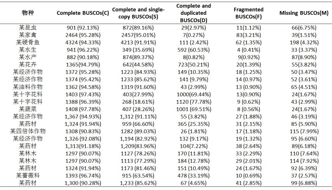 BUSCO評(píng)估結(jié)果(部分物種)