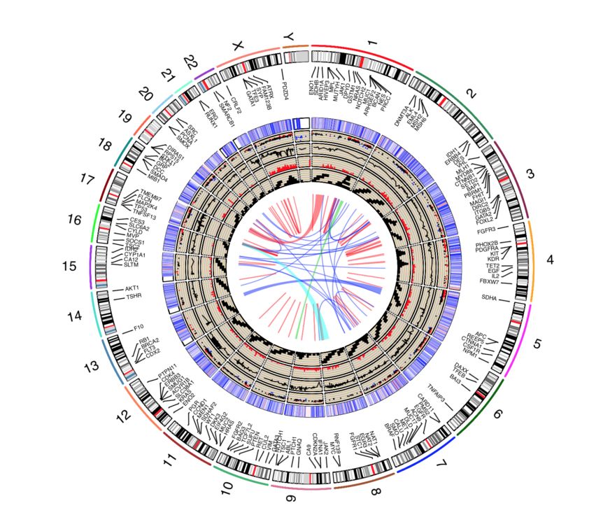 Circos圖是在基因組相關(guān)的分析結(jié)果展示中非常常見(jiàn)的一類(lèi)圖型。由于Circos圖中展示的信息量大,圖形十分美觀,很多文章中都會(huì)繪制類(lèi)似的圖形。從圖形的內(nèi)容來(lái)看,Circos圖實(shí)際是將多個(gè)類(lèi)型的圖片,包括散點(diǎn)圖、直方圖、折線圖、熱圖等,經(jīng)過(guò)變形以后疊加顯示在染色體上。本質(zhì)上是多個(gè)圖形的組合。