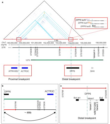作者設(shè)計引物擴(kuò)增連鎖區(qū)域去證實這些變異,結(jié)果發(fā)現(xiàn)PCR產(chǎn)物在兩個7號染色體的位點(diǎn)比對到了相反的方向,且距離將近4Mb。7號染色體上的局部比對,證實了反向雜合低拷貝重復(fù)的出現(xiàn)。遠(yuǎn)端的斷點(diǎn)位于7q36.2連鎖區(qū)域上,DPP6基因的1號內(nèi)含子上,被預(yù)測改變了基因的編碼序列;臨近的倒位斷點(diǎn)位于連鎖區(qū)域之外。