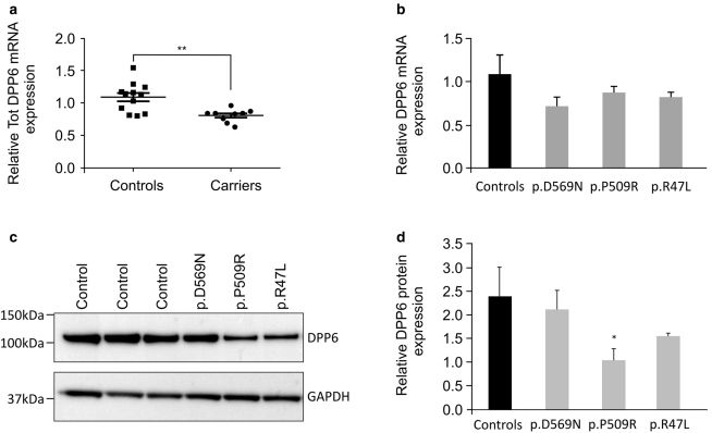 只有3個攜帶DPP6無義突變的患者的解剖大腦被凍存。這三個患者的神經(jīng)病理學(xué)診斷分別是阿爾茲海默癥AD,F(xiàn)TLD-TDP typeD(FTD行為變異和佩吉特氏骨?。?,F(xiàn)TLD-ALS type B(FTD行為變異及球類型)。結(jié)果發(fā)現(xiàn)三個DPP6變異(p.P509R, p.R47L, and p.D596N)?的mRNA表達(dá)水平顯著下調(diào),并且發(fā)現(xiàn)p.P509R和p.R47L 攜帶者的DPP6蛋白表達(dá)水平也顯著下降。
