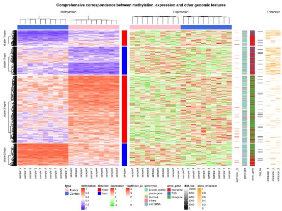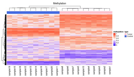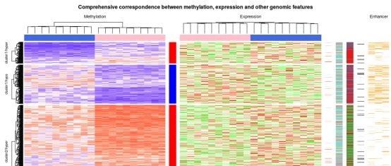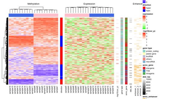 本次,我們將展示一個甲基化與表達(dá)譜聯(lián)合分析的熱圖。本著先學(xué)習(xí)再創(chuàng)造的態(tài)度,小編做了一下知識的搬運(yùn)工,本篇所有代碼均引用自:Zuguang Gu, Roland Eils and Matthias Schlesner,?Complex heatmaps reveal patterns and correlations in multidimensional genomic data,?Bioinformatics, 2016。