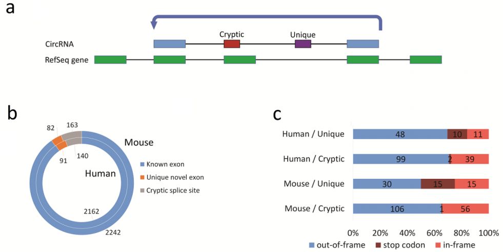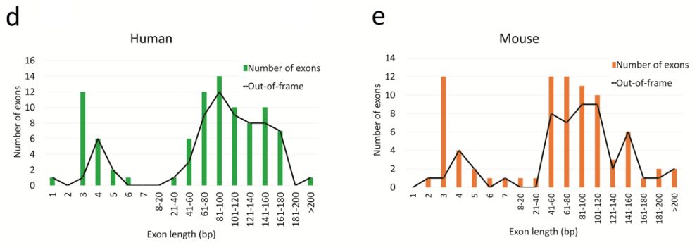 將circRNA根據(jù)新外顯子使用分類為“隱蔽的circRNA外顯子”(與注釋的外顯子共享5’或3’剪接位點(diǎn))或“獨(dú)特的circRNA外顯子”(全新的外顯子)。人類2,393個(gè)外顯子中的91個(gè)和小鼠中2,487個(gè)外顯子中的82個(gè)是獨(dú)特的circRNA外顯子,140和163個(gè)分別是隱蔽的circRNA外顯子。(所有單外顯子circRNA都被排除在該分析之外,因?yàn)樵趩蝹€(gè)read中需要完全覆蓋檢測(cè)到的外顯子,這對(duì)于單個(gè)外顯子circRNA而言在技術(shù)上是不可能的。)作者發(fā)現(xiàn)大多數(shù)獨(dú)特的circRNA外顯子在40-200bp范圍內(nèi),但也經(jīng)常觀察到3-6bp的非常短的外顯子(微外顯子)組。有趣的是,大多數(shù)circRNA特異性外顯子導(dǎo)致移碼突變或終止密碼子獲得,可能解釋了它們?cè)诰€性mRNA翻譯中缺失,因此受到無義介導(dǎo)降解。