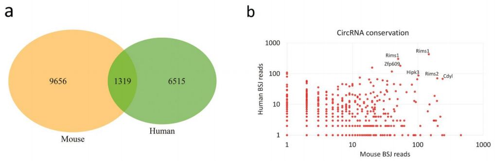 人和小鼠circRNA文庫(kù)的納米孔測(cè)序分別產(chǎn)生0.67M和1.06M reads,其中3.2%和3.3%跨越circRNA BSJ(Back splice junction)位點(diǎn)。人和小鼠中分別鑒定到7,834和10,975個(gè)circRNA,其中1,319個(gè)在人和鼠中保守的circRNA。在最高表達(dá)和保守的circRNA中,發(fā)現(xiàn)眾所周知的腦circRNA,例如circRims1、circRims2、circHipk3、circCdyl和circZfp609。整個(gè)數(shù)據(jù)集中,分別來自人和小鼠的2,945和7,052個(gè)circRNA先前未在circBase中注釋。