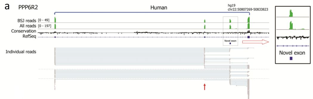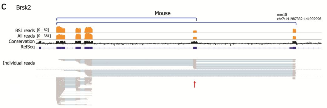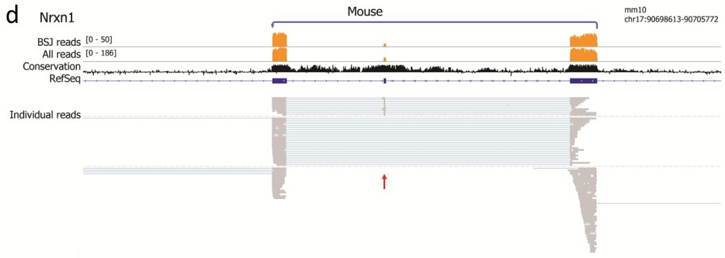 環(huán)狀RNA(circRNA)是一類知之甚少的非編碼RNA,其中一些已被證明對(duì)細(xì)胞增殖和發(fā)育具有功能重要。CircRNA主要來自編碼mRNA的反向剪接事件,使得難以區(qū)分circRNA與線性剪接的mRNA的內(nèi)部外顯子組成。為了檢查circRNA的全局外顯子組成,作者使用納米孔技術(shù)對(duì)人和小鼠腦源RNA進(jìn)行了單分子長(zhǎng)讀長(zhǎng)測(cè)序。